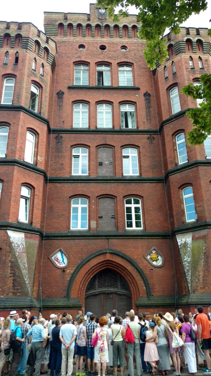 Następnie ruszyliśmy do kompleksu budynków wojskowych zwanych od koloru cegły „czerwonymi koszarami”. Po drodze zatrzymaliśmy się w Parku 3 Maja w cieniu topoli czarnej, która jest jednym z miejskich pomników przyrody. „Czerwone koszary” powstały pod koniec XIX wieku według projektu Emila Drewsa. Powstanie tego monumentalnego zespołu koszarowego było możliwe dzięki ogromnym odszkodowaniom, które Francja wypłaciła Prusom po wojnie 1870 roku. W koszarach tych stacjonował 9. Kołobrzeski Pułk Grenadierów hrabiego Gneisenau. Przymiotnik „kołobrzeski” został nadany po bohaterskiej obronie twierdzy Kołobrzeg podczas wojen napoleońskich. Imię hrabiego Gneisenau zostało nadane na setną rocznicę powstania pułku. W miejscu tym stacjonowało nawet 5 tysięcy żołnierzy. Pułk grenadierów rozwiązano po traktacie wersalskim (1815 r.) a budynki koszar przekazano jednostkom Reichswery. Zwiedzający mieli możliwość wejścia na dziedziniec koszar oraz do sieni ich 3 budynków.