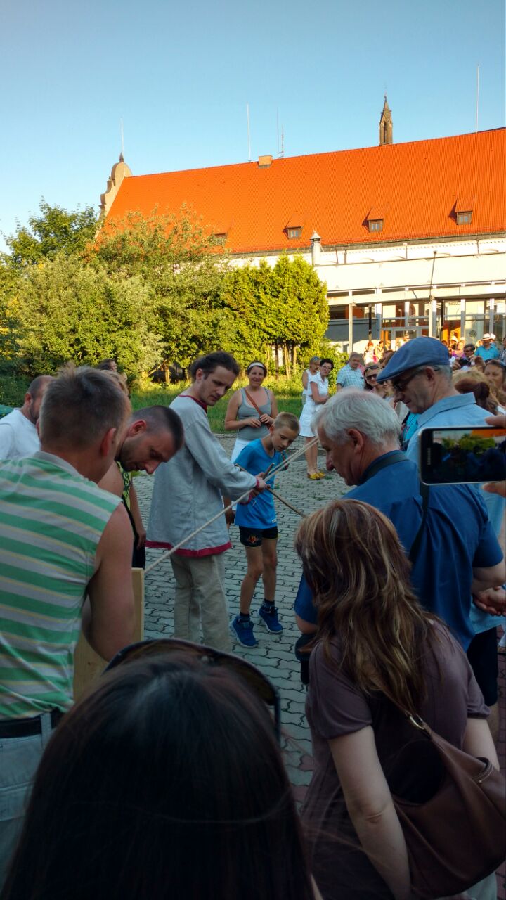Stamtąd ruszyliśmy w kierunku dawnego Targu Drzewnego, gdzie czekał już na nas powroźnik Martinus (w tę postać wcielił się Marcin Burdziej z Muzeum Archeologiczno-Historycznego w Stargardzie), czyli rzemieślnik zajmujący się produkcją lin. Przy użyciu odpowiedniego sprzętu rozstawionego wzdłuż chodnika oraz przy pomocy silnych mężczyzn biorących udział w spacerze udało się ukręcić gruby sznur, tak jak robiono to przed wiekami.