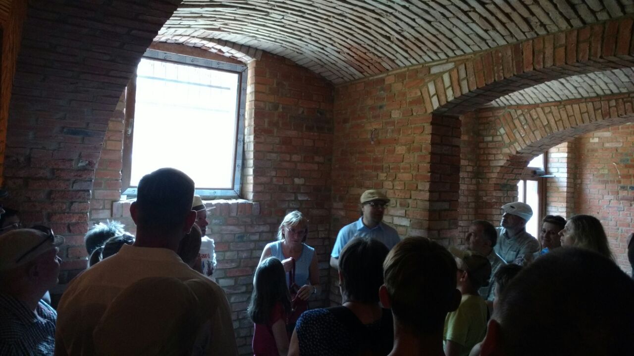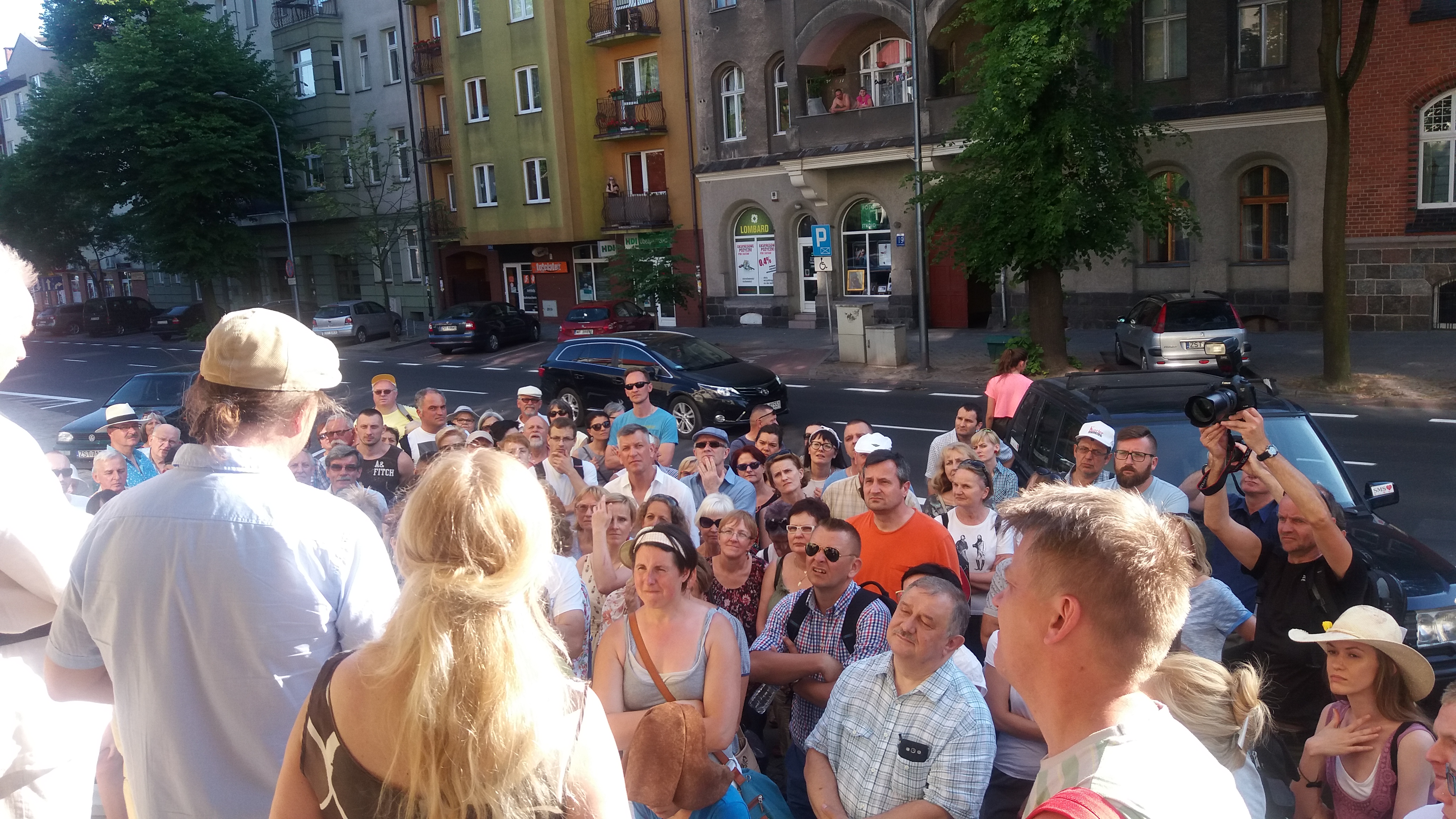 W gorące i słoneczne popołudnie uczestnicy spaceru zgromadzili się przed niedawno odnowionym budynkiem Młodzieżowego Domu Kultury przy ulicy Portowej. Tam przywitał nas gospodarz spaceru wraz z Panią dyrektor MDK, Elżbietą Szumską. Na początek obeszliśmy budynek dookoła zatrzymując się przy każdej z jego fasad i podziwiając detale architektoniczne zdobiące słynną willę Karowów, bo to właśnie do tego rodu przed II wojną światową należała wspomniana rezydencja oraz młyn mieszczący się po przeciwnej stronie ulicy. Pani dyrektor MDK zaprosiła spacerowiczów do wnętrza i opowiedziała historię rodu Karowów, wspominając też o ich filantropijnej działalności. Można było zobaczyć między innymi pokój i gabinet właściciela rezydencji, Gustawa Karowa. Okna w tym pomieszczeniu zostały tak rozmieszczone, aby właściciel mógł przez nie doglądać prac w młynie jak i podziwiać park przyległy do willi.