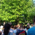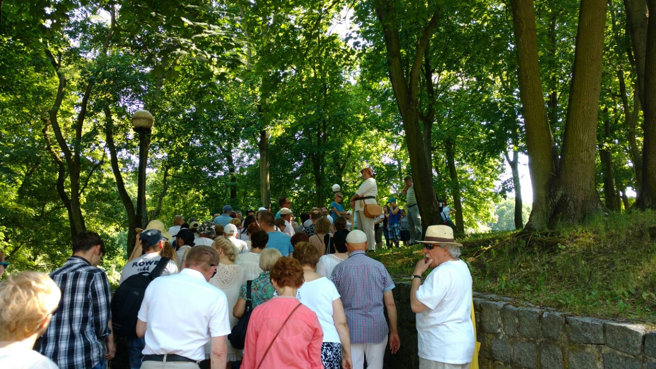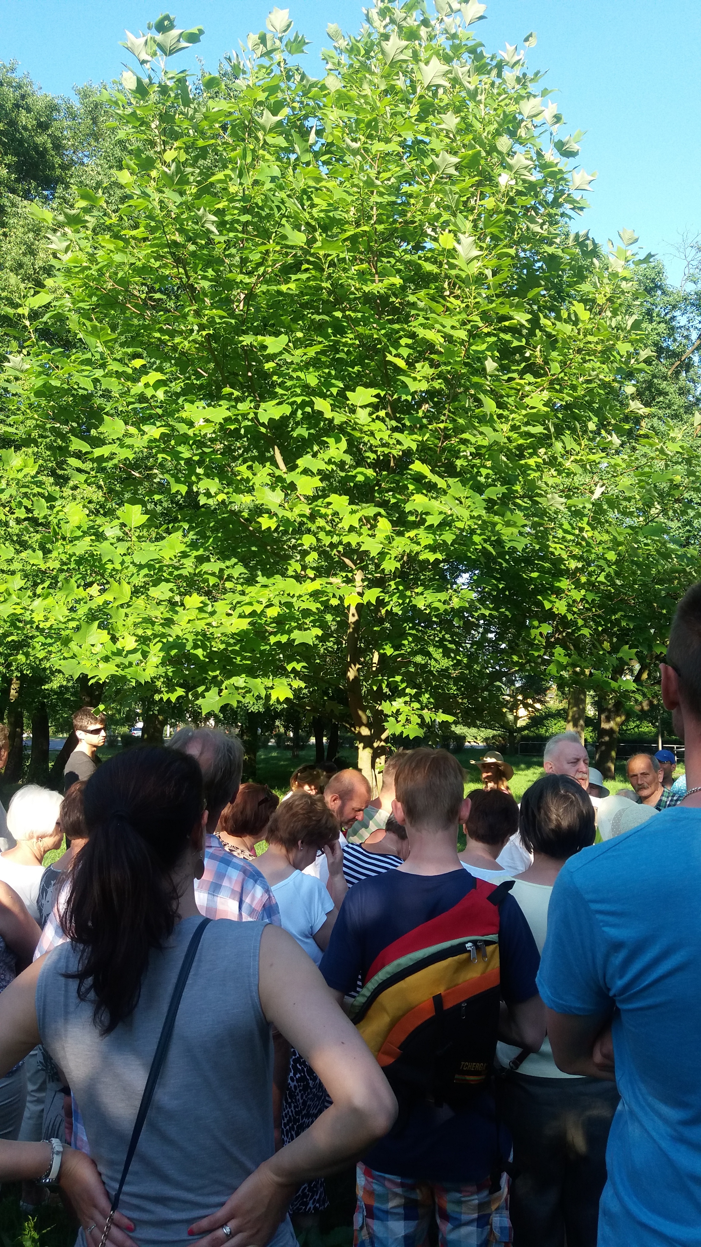 Dalszym punktem spaceru był Park Popiela. Tam wysłuchaliśmy krótkiej historii feldmarszałka Gerharda von Blüchera którego imię przed II wojną światową nosił ten park, i w którym to znajdowała się (nie istniejąca już) studnia powstała dla upamiętnienia feldmarszałka. Blücher dowodził armią pruską podczas wojen napoleońskich, między innymi w zwycięskiej bitwie pod Waterloo. Ponadto był członkiem loży masońskiej, która również w naszym mieście miała swoją siedzibę (przy dzisiejszej ul. Krzywoustego, następnie w kamienicy przy ul. Bogusława IV). Nieopodal w Parku Jagiellońskim podziwialiśmy kolejne unikatowe drzewo w naszym mieście – tulipanowca amerykańskiego oraz pozostałych 7. z 9. dębów zasadzonych na 80. urodziny kanclerza pruskiego Otto von Bismarcka. Popiersie tego wybitnego „anty – Polaka” znajdowało się niegdyś za kościołem świętego Jana.