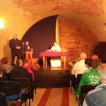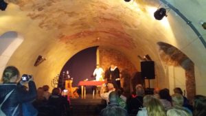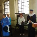 Z tego miejsca ruszyliśmy do ostatniego punktu na mapie naszej wycieczki – do Piwnicy Towarzystwa Przyjaciół Stargardu. Tam czekał na nas już pewien dawny stargardzki rzemieślnik, garncarz Piotr. W jego rolę wcielił się Pan Marcin Majewski, dyrektor Muzeum Archeologiczno-Historycznego. Panowie na zakończenie przenieśli nas w czasie do połowy XVII wieku i odegrali scenkę odwiedzin burmistrza Groeninga u rzeczonego rzemieślnika, aby przy winie podyskutować o bieżących sprawach: o stargardzianach, o wojskach cesarskich co to panoszą się w naszym mieście, o rychłym ożenku burmistrza, o statucie miejskim ale przede wszystkim o…. piecu kaflowym, co to się w ratuszu rozwalił i ktoś naprawić go musi….