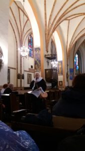 Spacer rozpoczęliśmy od kościoła świętego Jana Chrzciciela, patrona Stargardu. Początkowo skryci w sieni budynku, zaproszeni zostaliśmy do środka aby wygodnie zasiąść w ławach i w skupieniu wysłuchać jego burzliwej historii.