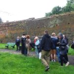 W dalszej kolejności skierowaliśmy swoje kroki w kierunku miejsca powstaniu dawnego grodu, jeszcze przed lokacją. Zatrzymaliśmy się więc przy murach miejskich nieopodal Baszty Białogłówki. Nasz postój był tu nieco dłuższy. Wysłuchaliśmy historii o pierwszym grodzi otoczonym palisadami, o porcie, który znajdował się nieopodal, o bramie celnej (dziś Brama Młyńska), która odegrała ogromną rolę w rozwoju gospodarczym miasta. Wysłuchaliśmy historii rozwoju osady targowej, powstania kaplicy, na miejscu której postawiono najstarszy kościół w mieście oraz o okolicznościach powstania widocznych do dziś wałów. Usłyszeliśmy również losy legendarnego kasztelana Huka.